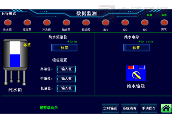 8、智能安全保护措施,密码进入操作界面,有电导率显示和记录,具有记录高压泵、电磁阀等部件使用程度的长期数据,以备运行状态分析所用,同时自动保存。